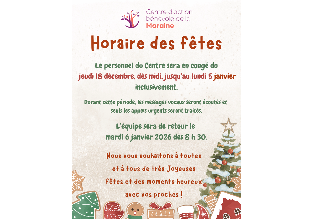 Les bureaux seront fermés du jeudi 18 décembre midi jusqu’au lundi 5 janvier inclusivement.